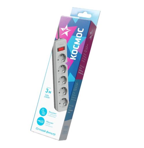 Удлинитель с сетевым фильтром 5х3м с заземл. 10А IP20 2.2кВт ПВС 3х0.75 с выкл. с индикатором сети сер. КОСМОС FKsm3m-5g(G) с двумя защитами для гаджетов и дорогой техники – варистор для защиты от «плохого» тока и терморазмыкатель для защиты от перегрузки и замыкания в сети. Сзади специальное крепление – можно повесить на стену. Корпус из негорючего полипропилена, 100% медный кабель ПВС 3х0,75мм (с заземлением). Контактная группа из латуни не деформируется со временем. Максимальная мощность подключения 2200Вт – хватит для нескольких устройств одновременно.